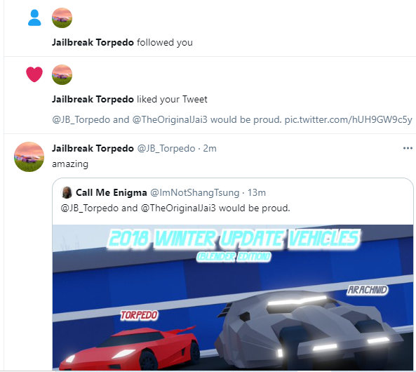 Post a Comment for "Jailbreak Twitter Code : Torpedo guy followed me on twitter V: | Fandom"