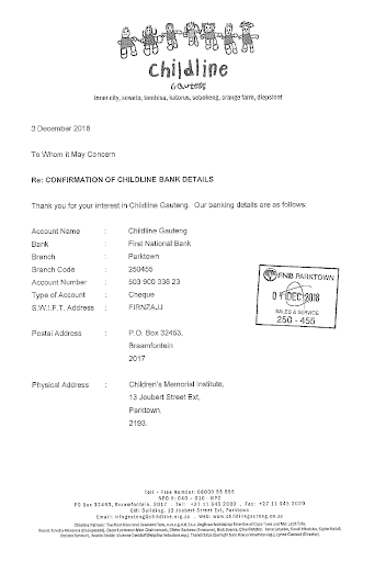 Bank Account Details Confirmation Letter - Childline Gauteng from childlinegauteng.co.za The first step includes your personal information about what is your. Dear sir, confirmation of bank account of 36963223620123 (new lanka (pvt) ltd). Guide, letter example, grammar checker, 8000+ letter samples. Additionally, you should use a provide only relevant details. Just copy and paste from the template. Kindly note that we have changed our bank details with lloyds tsb bank plc from 11th april,2013.the newdetails areshown below. A letter written to a bank is a formal correspondence. Learn to write a professional letter for opening a bank account.
